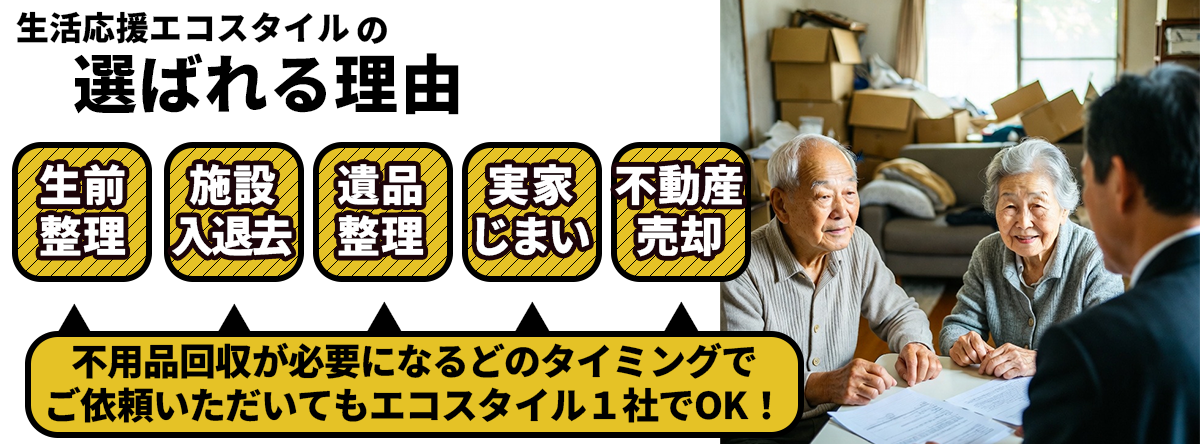 元気なうちに身辺整理をされたいという御客様も多くいらっしゃいます。終活に伴う生前整理・老前整理として不用品回収を行います。老人ホーム入居前に片付けなどご相談ください。